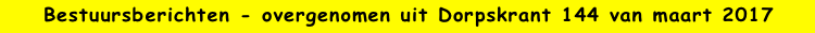 In het eerste kwartaal van 2017 heeft het volledige bestuur éénmaal een bestuursvergadering gehouden en natuurlijk traditiegetrouw de jaarvergadering. Daarnaast is met penningmeester, secretaris en voorzitter een laatste overleg geweest ter voorbereiding op de jaarvergadering. Hoewel met de jaarvergadering iets minder leden aanwezig waren dan andere jaren, was het enthousiasme niet minder. De aanwezige hebben met aandacht geluisterd naar het wel en wee van niet alleen onze Dorpsvereniging, maar ook van andere verenigingen en instellingen in ons dorp. Een andere belangrijk onderwerp van de bestuurstafel is de fusie van de gemeente. Het bestuur van de dorpsvereniging wil geen politieke voorkeur uitspreken, maar vindt wel dat het gelopen proces hier naar toe door de gemeente goed is uitgevoerd. Hiervoor heeft het bestuur een positieve zienswijze ingediend bij de gemeente. Verder is te melden dat er ook nog andere belangrijke overleggen door vertegenwoordigers van het bestuur in dit kwartaal zijn bijgewoond. Hierin te noemen is het halfjaarlijks overleg met de gemeente. Besproken onderwerpen zijn: het kernenbeleid binnen de gemeente, gebiedsvisie en mogelijkheden Penningsveer, groenstructuurplan, oplevering Liedeweg, asfalteren deel Kerkweg, parkeren nabij school en ontwikkelingen Polanenpark. Een ander te noemen overleg is die met de kiesmannen van Cluster Polderbaan ORS. In dit overleg is het aantal nachtvluchten besproken en hoe de toekomst van Schiphol eruit kan gaan zien na de komende verkiezingen. De politieke koers kan hierin veel gaan betekenen. Het Bestuur. | ||