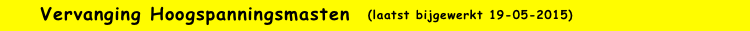 Actueel Begin 2015 is de aanleg zichtbaar begonnen. De eerste masten zijn bij Beverwijk geplaatst en waren vanuit het dorp zichtbaar. In maart 2015 is begonnen met het aanleggen van tijdelijke werk-wegen in de polder, o.a. nabij de A9. Op 27 mei 2015 organiseert Tennet in samenwerking met de Dorpsvereniging een inloop informatiemarkt in de Zoete Inval. Uitnodiging. Uitnodiging informatiebijeenkomst hoogspanning (19-05-2015-CBu) . | ||||